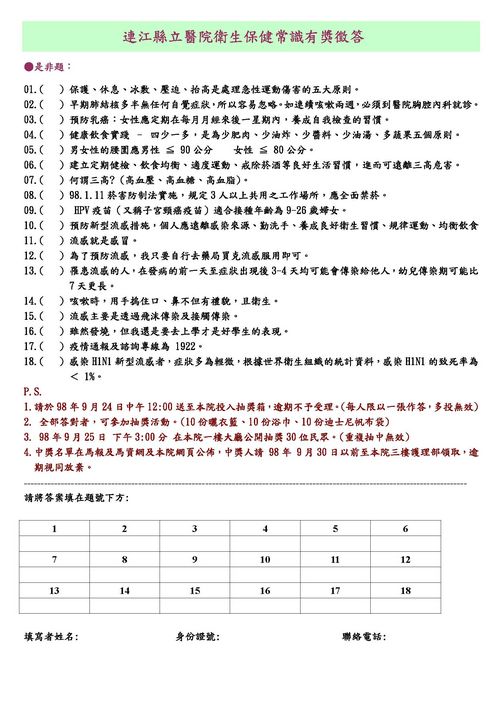縣立醫院特別舉辦「衛生保健常識有獎徵答」,鄉親只要填妥答案,於即日起至今年九月廿四日中午十二時前,郵寄或親送達本院,逾期不予受理,每人限以一張作答,多投無效,全部答對者即可參加抽獎活動。