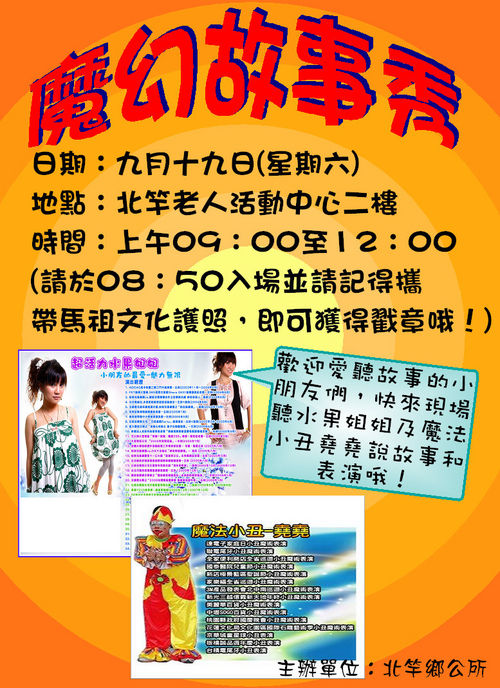歡迎愛聽故事的小朋友們來現場聽水果姐姐說故事及魔法小丑堯堯表演哦