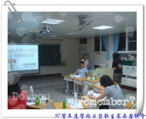明日的學校日活動,中正國小除了將在活動中告知學生家長學校本年度的教學計畫與未來的教學活動外,並成立各班班親會組織以提供學校老師和學生家長彼此間的溝通互動機會,當晚將播放97學年度學校活動精彩回顧影片,要讓家長瞭解學校歷年的活動成果,也希望家長能更瞭解家庭教育與親職教育的重要。希望明晚家長們能踴躍參與學校日暨新生家長座談會活動。