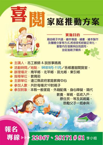 喜閱家庭推動方案-9/26四鄉同步登場 --閱讀人次 : 1531 由連江縣政府教育局家庭教育中心主辦『喜閱家庭推動方案』,各鄉將分別舉辦五場次的親子共讀活動,第一場次各鄉辦理時間及地點如下: