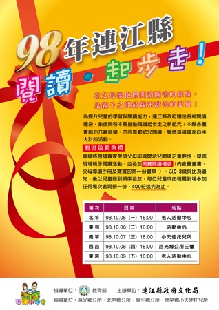 由連江縣政府贈送各鄉閱讀禮袋,象徵開啟本縣推動閱讀起步走之新紀元!典禮於各鄉舉辦,會場除聘請專家帶領父母認識嬰幼兒閱讀之重要性、舉辦現場親子閱讀活動,並發放免費閱讀禮袋,以0-3歲貝比為優先,後以兒童簽到順序發放,每位兒童或由親屬到場參加任何場次者現領一份,400份送完為止。