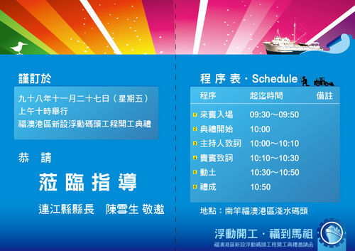 謹訂於98年11月27日(星期五)上午10時假福澳港淺水碼頭舉行福澳港區新設浮動碼頭開工典禮,縣長陳雪生誠摯邀請您一起掀開歷史新頁。