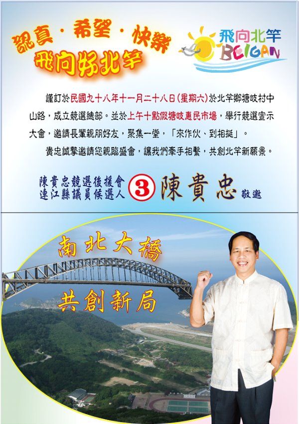 總結,「永續經營、深化人文、北竿風情、再造榮景」是我貴忠未來四年的政見主軸。請各位賢長、鄉親、好友們,給貴忠打氣,三號貴忠將以身相許,鞠躬盡粹,來饋對您們的長期愛載與真心支持。(謝謝!)