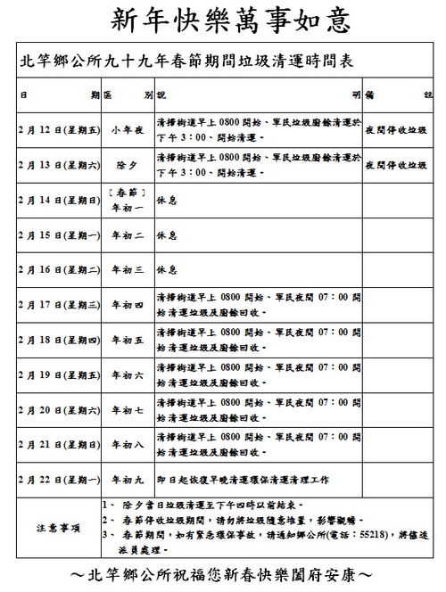 北竿鄉公所九十九年春節期間垃圾清運時間表