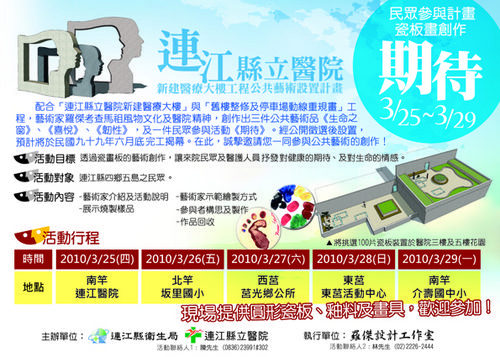 縣立醫院公共藝術活動,邀請民眾共襄盛舉! --閱讀人次 : 2709 連江縣立醫院公共藝術的民眾參與活動「期待」,將於今年(99)三月下旬在馬祖四鄉五島開跑,藝術家邀請全縣民眾共襄盛舉!