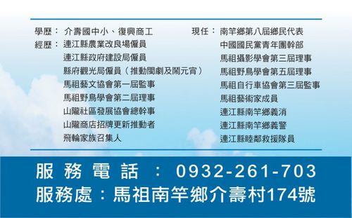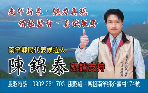 南竿【錦】地、九村【泰】來 懇請鄉親持續給予錦泰支持與鞭策 。 我秉持積極監督、真誠的心為大家服務~~~ 陳錦泰鞠躬