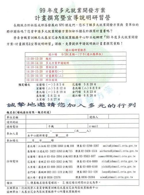 快~快~快來報名多元就業計畫撰寫暨宣導會-連江就業服務站 --閱讀人次 : 1947 99年多元就業開發方案-計畫撰寫暨宣導會-連江就業服務站