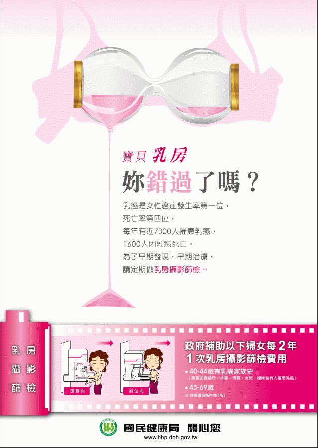 健保補助45~69歲女性每兩年一次免費乳房X光攝影檢查,本縣尚無合格乳房攝影