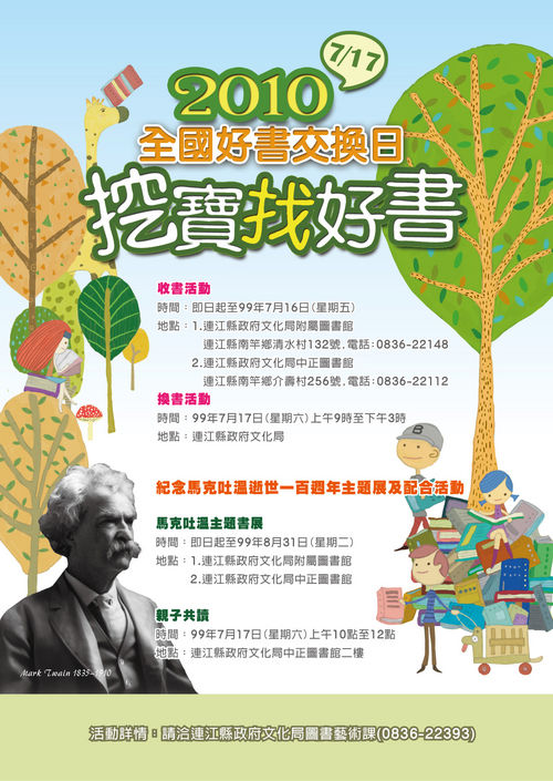 【文轉載馬祖日報】2010全國好書交換日,本週六登場!7月17日上午九時到下午三時文化局讓你挖寶找好書,配合馬克吐溫逝世一百週年紀念活動,當天還有親子共讀活動,地點在中正圖書館二樓,到七月十六日止,南竿兩個圖書館仍繼續收書,請大家踴躍捐書、換書、共享書香。