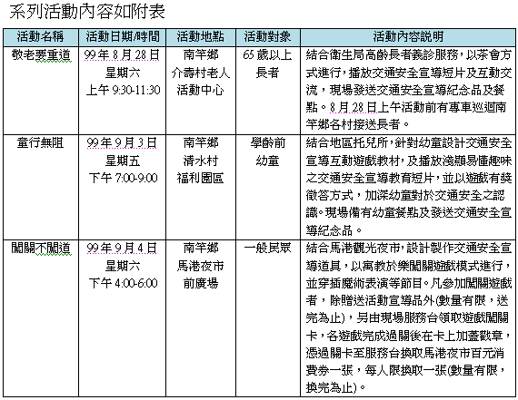 由交通部道安委員會指導,連江縣政府主辦「連江縣99年度交通安全宣導系列活動」,為宣達交通安全法規及正確交通安全觀念,加強宣導道路安全,將針對地區與民情屬性,今年別出心裁透過各個不同宣導主題及方式,針對一般民眾、高齡長者及幼童展開宣導,期許達到最佳效益。承辦單位連江縣政府交通局竭誠邀請鄉親朋友共同參與為交安盡一份心力。
