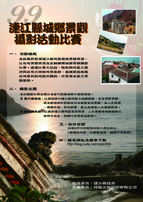 活動徵選照片時間自99年9月15日起至99年11月30日止, 資料備齊後,以掛號方式於收件截止日(以郵戳為憑)郵寄至20941台北市八德路四段106巷2弄19號4樓(請註明「連江縣城鄉景觀攝影比賽組」),內 容須包含報名表、實體相片、作品光碟。評選辦法將聘請國內名攝影家組成評審委員會於99年12月10日公開評審。頒獎及公告得獎結果為99年12月20 日,於縣府地下室一樓舉行。
