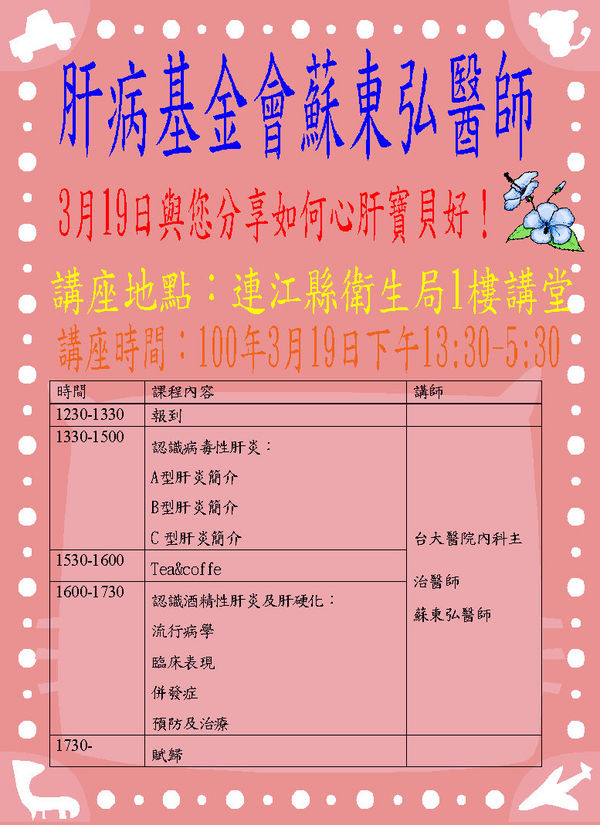 肝病基金會蘇東弘醫師3/19愛肝講座 --閱讀人次 : 3890 肝病,一直被稱作是我們的國病,隨著國人的醫療知識越來越充足,但是對於肝炎很多基本的觀念仍有錯誤、不足的地方,故特別邀請蘇東弘醫師指導A、B、C型肝炎的基本知識及觀念。
