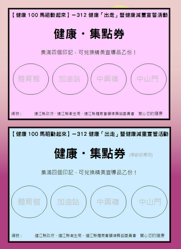 健康集點券(於途中4個給水站<體育館、梅石加油站、中興嶺、中山門>集滿4個印記才可於終點站兌換宣導品乙份)