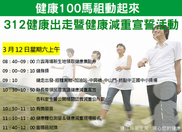 312健康"出走"暨健康減重宣誓活動 --閱讀人次 : 2809 為推動「健康100馬祖動起來」減重計畫,達到本縣減重300公斤的目標,本局訂於3月12日舉辦健康「出走」暨健康減重宣誓活動。藉由健走方式啟動【健康100馬祖動起來】-健康減重計畫,邀請縣長及各局室主管共同宣誓全縣動員減重300公斤的承諾與決心,並帶動縣民健康減重,打擊肥胖的動力。歡迎鄉親共同來參加!