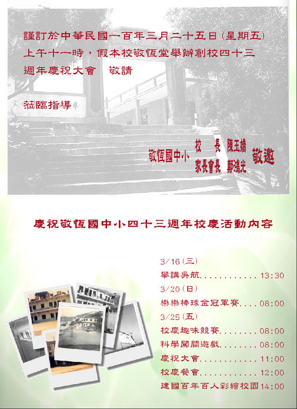 敬恆創校四十三週年校慶活動 --閱讀人次 : 1841 本校配合建國一百年及創校四十三週年校慶,於3/16-3/25將安排一系列的慶祝活動。明日下午將邀請本校退休林滿棟組長來跟同學分享敬恆的過往歷史,地點在國小三樓活動中心,歡迎校友及社區有興趣的民眾一同緬懷敬恆過往風光。