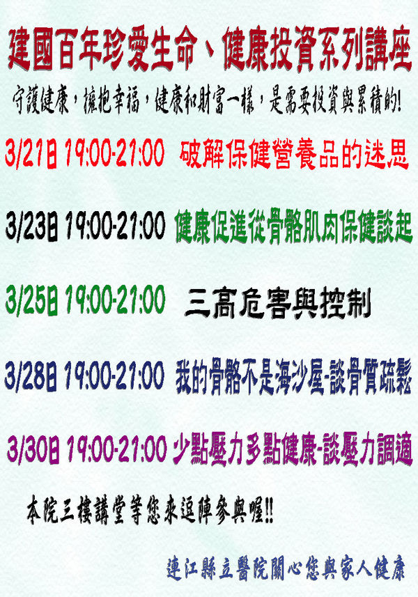 建國百年珍愛生命、健康投資系列講座-邀請您鬥陣來參與
