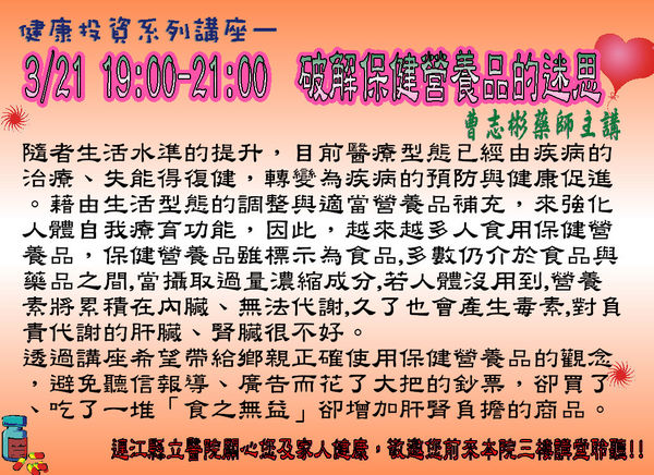 連江縣立醫院關心您及家人健康,邀請您來聆聽健康投資系列講座。