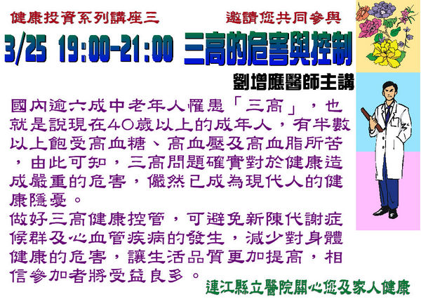 講師將以專業的知識及豐富的經驗,與大家一起分享如何預防三高文明病,為民眾的健康打好基礎。