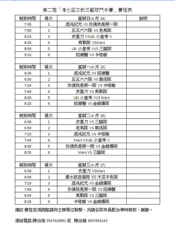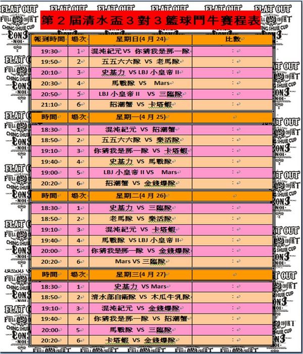 第二屆「清水盃三對三籃球鬥牛賽」賽程表 --閱讀人次 : 1870 第二屆「清水盃三對三籃球鬥牛賽」4/24-4/27(預賽)賽程表~~
