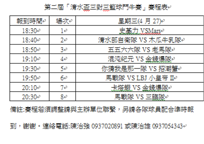 第二屆清水盃三對三籃球鬥牛賽賽程異動通知