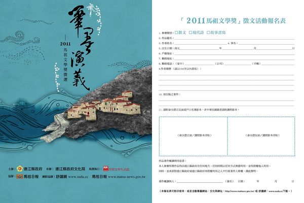2011馬祖文學獎徵選開跑 歡迎踴躍投件!! --閱讀人次 : 1985 【記者劉秋月�南竿報導】2011馬祖文學獎徵選活動熱烈展開,徵選主題為馬祖演義,書寫與馬祖文化相關的生活印象、遊歷心得、島嶼感想、家鄉故事等,徵選類別為散文、新詩及故事書寫,首獎獎金三萬元,即日起開始收件至八月一日止,成績與發表將於十月一日在《INK印刻文學生活誌》十月號、網路同步公布。