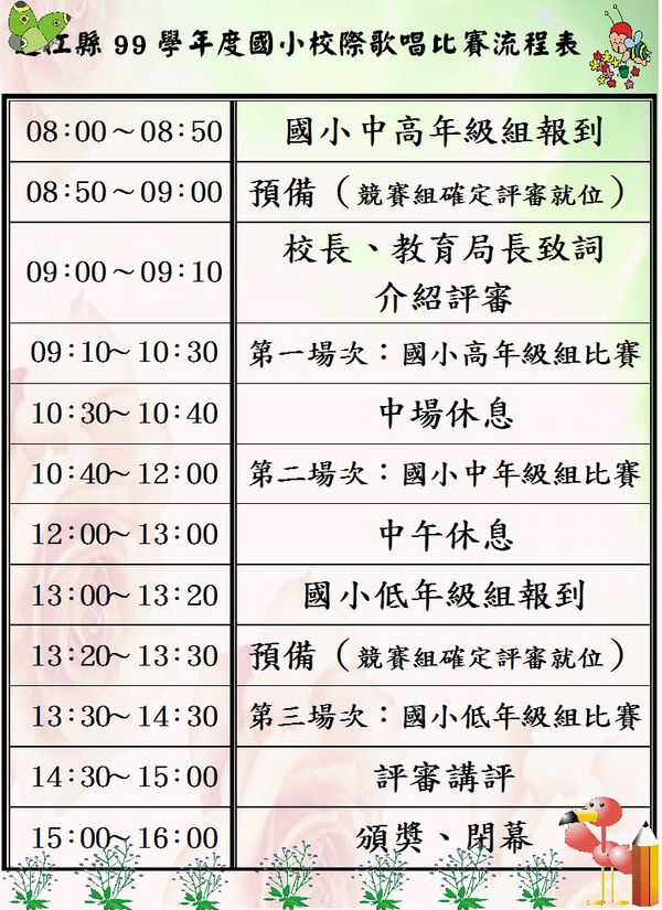 一年一度的國小校際歌唱比賽又來囉!今天上午九點開始,在中正國中小大禮堂展開,依低、中、高年級分三個組別,分別取最優前三名及優選兩名,由教育局頒發獎狀及獎金,但凡參賽者,賽後也可獲得紀念品及成果紀念光碟一份。