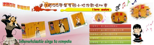 建國百年國小校際歌唱比賽5/14九點在中正國中小舉行 --閱讀人次 : 1470 連江縣九十九學年度國民小學校際歌唱比賽,於5/14上午九點起,假中正國中小大禮堂隆重登場,為了慶祝建國百年今年歌唱比賽的主題特別訂為「建國百年、愛國歡唱」,其中共分為低、中、高年級三個組別,一一位大家帶來動人的歌曲,想要回味鏗鏘有利的愛國歌曲嗎?聽聽孩子們嘹亮動聽的歌聲,來一場美妙的音樂饗宴,來中正國中小就對了。