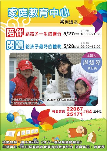 教育局家庭教育中心邀請城邦文藝基金會執行長周慧婷(前主播,另一半為金溥聰)開講,27日晚間6時半,28日上午9時在縣府地下一樓多媒體簡報室,歡迎鄉親踴躍報名,報名專線:22067、25171#64王小姐。