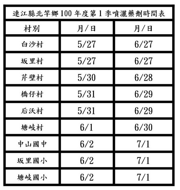 連江縣北竿鄉100年度第1季環境衛生用藥噴灑時間表: