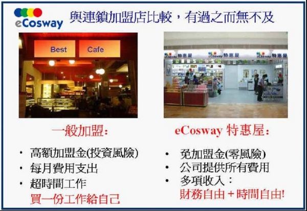eCosway特惠屋全球連鎖複合式專賣店的商業模式:透過自己使用產品,感覺它的價格與品質都可以接受,你就可以自己來開店或找人來開店,架構一個龐大的消費組織網路,創造屬於自己的一番事業。