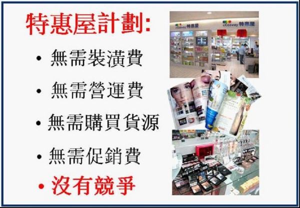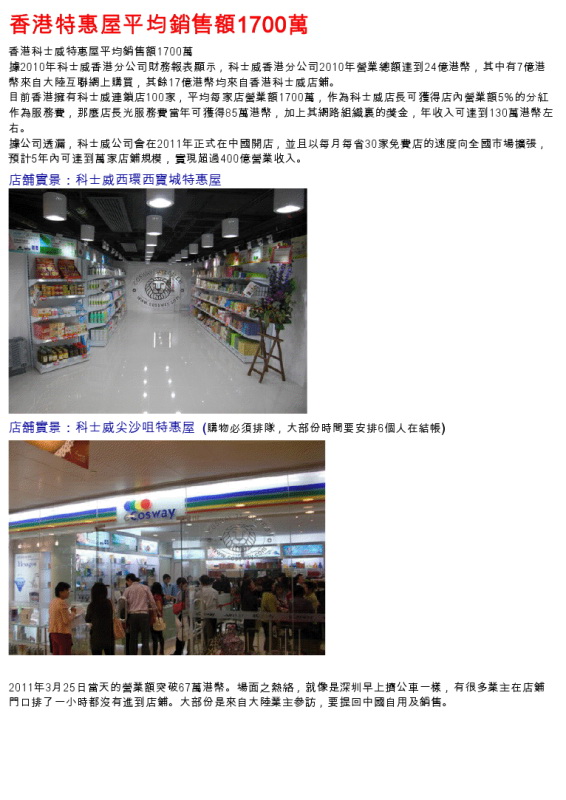 馬來西亞科士威集團2011年底即將進入中國大陸、這種免費的特惠店,將以每個月1000間左右的速度在全國遍地開花,預計兩年內將開設超過兩萬家的特惠屋。(科士威中國總部設立在廣州)。