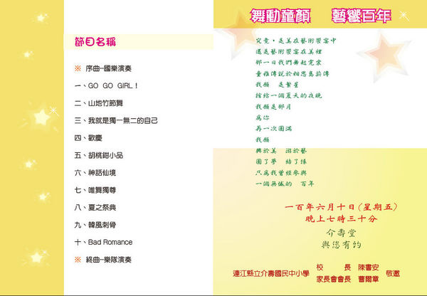 介壽國中小校長陳書安表示,初夏藝文成果展即將登場,誠摯邀請社會各界明晚光臨介壽堂聆賞,替師生們的辛勞加油打氣,並且不吝給予指導。