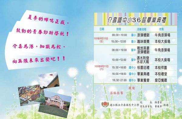 【又訊】介壽國中小第36屆畢業典禮活動11日下午16:00在禮堂舉行,下午15:30先行校園巡禮、18:30畢業餐會清水皇亞餐廳。