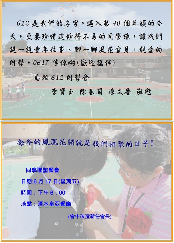 歡迎在台灣的同學一同回來歡聚,連絡電話 0932261764