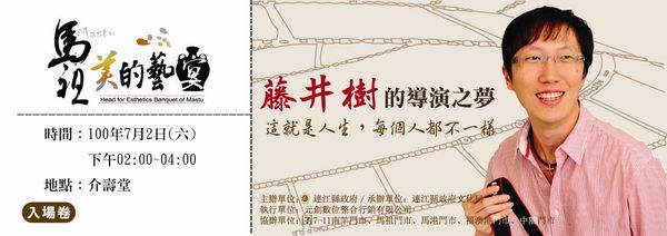 在主辦單位連江縣政府文化局邀請下,藤井樹本人將於7月2日在南竿介壽堂發表「『這就是人生,每個人都不一樣』藤井樹的導演之夢」講座,與聽眾分享他的導演夢想及創作歷程。講座門票請至南竿各7-11門市及北竿7-11門市索取,為回饋廣大聽眾,參加者填寫門票背面之聯絡資訊,並於活動當日投入摸彩箱,主辦單位將於講座結束後現場抽出「藝文券」幸運得主,招待名眾欣賞藝文表演!