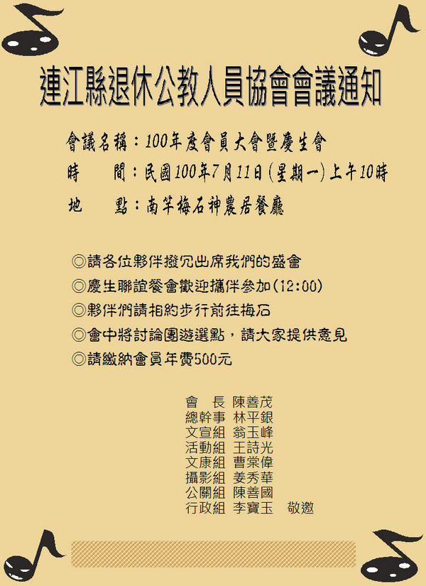 更多的訊息請造訪連江縣退休公教人員協會部落格http://tw.myblog.yahoo.com/matsu100