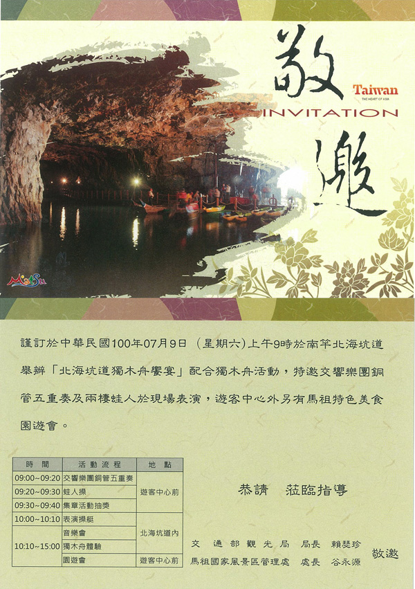 「北海坑道獨木舟饗宴」將於7月9日登場~ --閱讀人次 : 1434 北海坑道獨木舟活動經過一個月試營運,廣受好評。馬管處為響應民眾熱烈的參與,舉辦北海坑道獨木舟饗宴活動,7月9日上午9點在北海遊憩區及坑道內,邀請台灣知名交響樂團銅管五重奏演出及兩棲連弟兄現場操練, 除了聽覺及視覺上的享受外,還結合鐵板社區發展協會提供馬祖在地美食,滿足您的味蕾需求。在北海坑道內泡一壺當地特色茶,製作一甕專屬於自已的老酒,定是您人生難得的初體驗!當天預約老酒DIY只要450元(原價550元),再特別加贈一罐「紅糟料理醬」(價值150元),預約專線:0836-25631#34洽張小姐或mail至chunketty @ matsu-nsa.gov.tw,另外現場還會舉辦有獎徵答活動,獎品豐富,歡迎遊客與鄉親一同共襄盛舉。