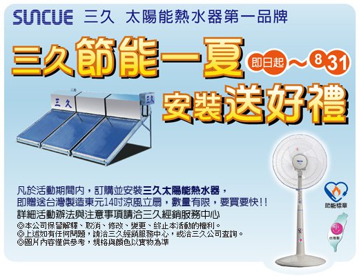 安裝三久太陽能熱水器,除了讓家裏更省電、節能、省錢、更可以減碳愛地球。買太陽能熱水器,三久送節能電風扇,讓大家有個舒適又省電的夏天。