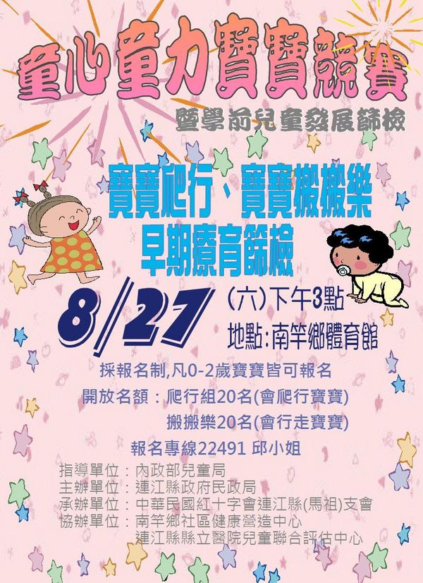 本次「童心童力寶寶競賽」暨學前兒童發展篩檢宣導,希望藉由0-2歲寳寳爬行等比賽來增添活動趣味性以及親子間的互動,另設有早療篩檢宣導區,用來進行全面性的早療概念宣導與篩檢,讓民眾對早期療育有更深一層的認識,除此之外,更能提升對遲緩兒童的重視及關懷。