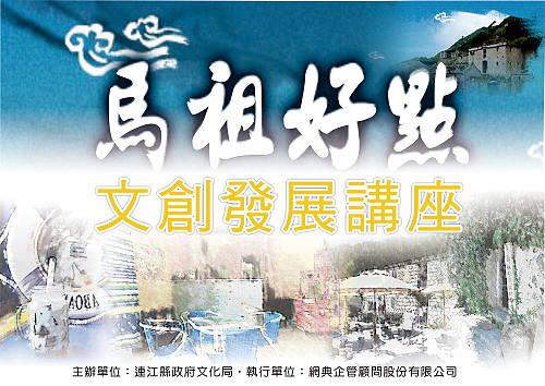 由連江縣政府文化局主辦、網典企管顧問股份有限公司執行的「100年連江縣文化創意產業發展計畫」,主要目的為推廣馬祖地區文創產業發展,本次特舉行兩場文創講座活動。講座時間為8/27(六)及8/28(日)早上10點至中午12點,週六講座地點在南竿鄉鐵板村「鐵板社區生活館」,週日講座地點在南竿鄉民俗文物館一樓教室舉行,歡迎有興趣的鄉親前往參加,欲知本活動詳細訊息可以洽詢執行單位網典企管顧問股份有限公司(02-25866522)。
