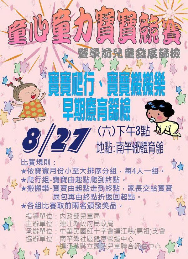 8/27「童心童力寶寶競賽」活動流程及比賽規則 --閱讀人次 : 1635 本次「童心童力寶寶競賽」暨學前兒童發展篩檢宣導,希望藉由0-2歲寳寳爬行等比賽來增添活動趣味性以及親子間的互動,另設有早療篩檢宣導區,用來進行全面性的早療概念宣導與篩檢,讓民眾對早期療育有更深一層的認識,除此之外,更能提升對遲緩兒童的重視及關懷。