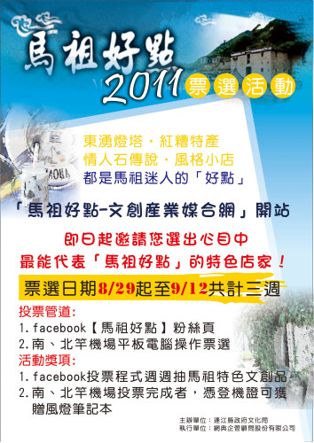 「2011馬祖好點票選活動」本週開跑!由連江縣政府文化局主辦、網典企管顧問股份有限公司執行的「100年文化創意產業發展計畫」,為推廣馬祖在地文化,特別舉辦為期三週的「馬祖好點」票選活動,希望透過民眾票選出最具代表性的馬祖特色店家。