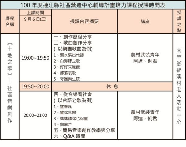 本培力課程,期藉由「農村武裝青年樂團」的創作歷程與經驗,來分享音樂創作與人、土地與鄉村連結的關係。並透過方言歌曲的賞析,來分析每一首歌曲背後的歷史背景與社會意義。透過上述之分享,讓社區居民更能體會音樂與身處環境的關聯,進而嘗試創作屬於自己或社區、土地的歌曲。