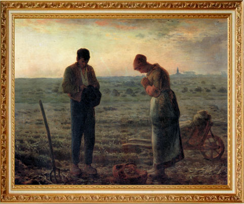 他回憶說:「......作畫時,我回憶起小時候和奶奶一起在田裡工作的情景,教堂的鐘聲使我們停下手裡的工作,虔誠的摘下帽子,說一聲『上帝拯救我們』。畫中的兩個農民,在做完一天繁重農事後正在進行祈禱。」