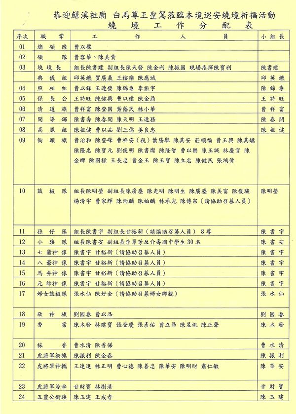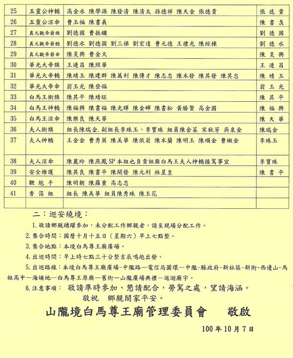一、10/13日週四敬請本境鄉親熱心參與廟會各項活動凡參與遶境及各分組工作鄉親志工,請至品樂百貨旁領取團體服。