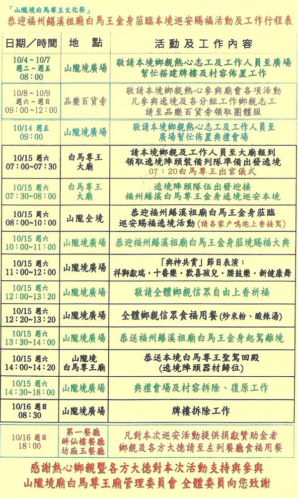 活動日期:國曆十月十五日(農曆九月十九日星期六)