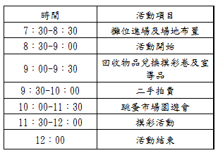 活動現場除提供民眾自行設攤外另有設置寄賣攤位,歡迎想交換或交易少量商品的民眾(每人五件內),於活動當天親自拿到活動現場來寄賣或交換,本次活動參加園遊會的擺攤商家,當日收益全額皆為設攤單位擁有,意即其收入及成本皆由擺攤者自行負責,攤位數量有限,歡迎社會團體、商家及餐廳報名擺攤,額滿為止。