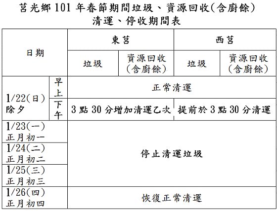 莒光鄉春節期間垃圾、資源回收(含廚餘) 清運、停收期間表
