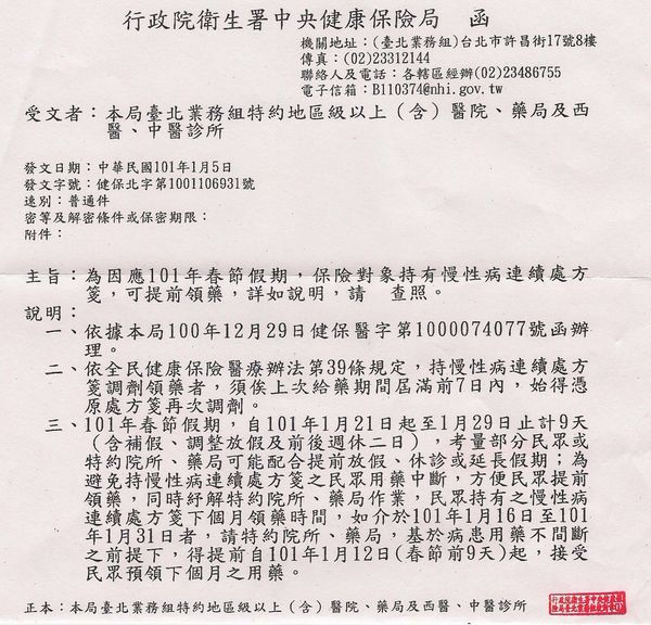 為因應春節假期較長,為避免用藥中斷,請持慢性病連續處方簽領藥的民眾注意,連續處方簽領藥時間介於101年1月16日至101年1月31日者,可提前自1月12日起預領下個月的藥物。