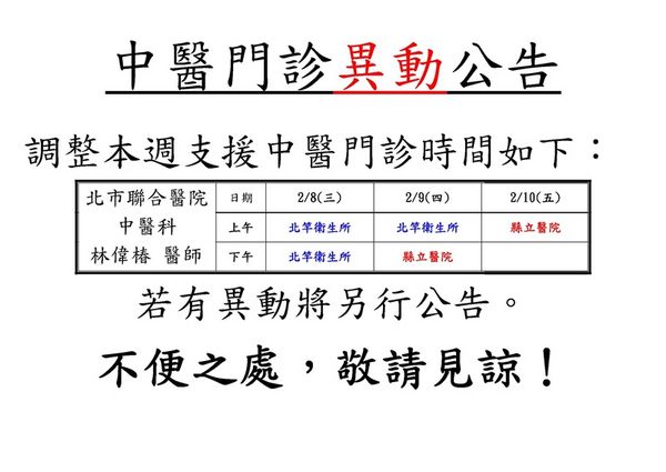 縣立醫院中醫門診異動公告